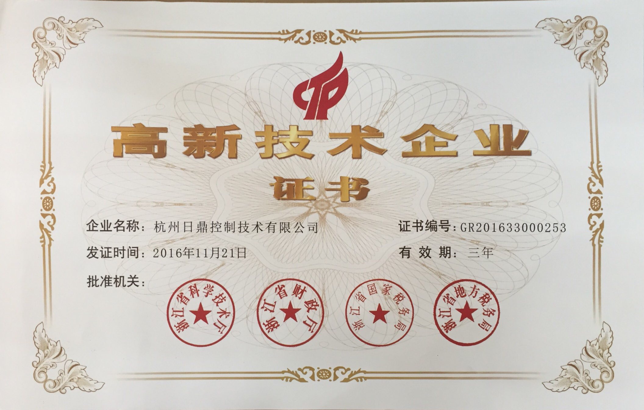 自2016年7月以来,通过一个月的资料收集、提交,以及后期几个月的专家小组综合评审,杭州日鼎控制技术有限公司顺利通过国家高新技术企业复审。在此,我们向广大新老客户承诺,我们将一直以国家高新技术企业的高标准严格要求自己,为大家提供优质的高新技术产品以及周到、快捷的售后服务,感谢业界朋友们对我们的信任和支持!
